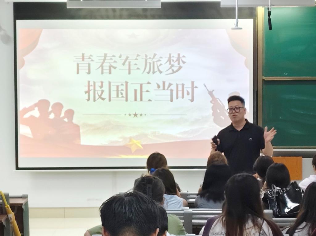 活动伊始,殷凯结合国际形势与国家发展需求,阐述了老员工参军入伍对个人成长和国防建设的重大意义,鼓励同学们将个人理想融入强军实践,用热血青春书写报国华章。随后,他详细给员工介绍了老员工入伍在学费补偿、升学深造、就业安置等方面的利好政策,并通过数据对比、案例分析,让同学们对参军入伍有了更清晰、全面的认识。