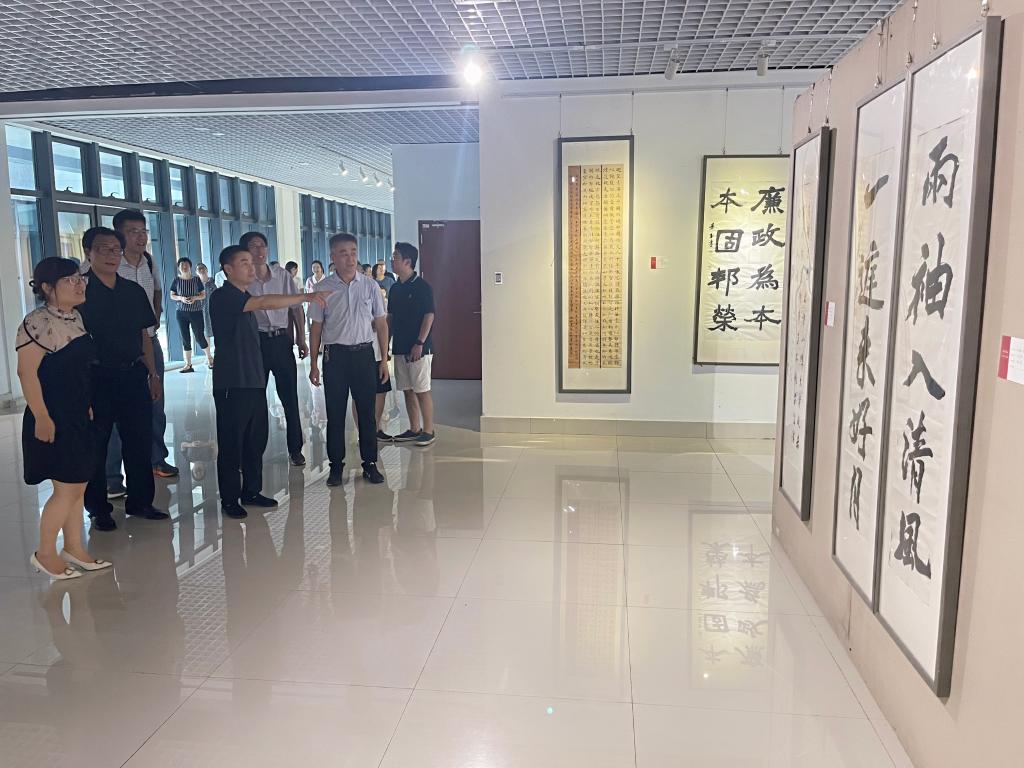 在美术与艺术设计公司副经理赵平的带领和讲解下,大家认真聆听了每幅作品创作背景和意义的讲解。参展作品主题鲜明、立意深远,集政治性、思想性、教育性、艺术性于一体,用以画说廉、以字言理、以图明纪等通俗易懂的艺术形式,在笔墨点染、光彩留影间,充分展示了廉洁文化建设的生动实践。